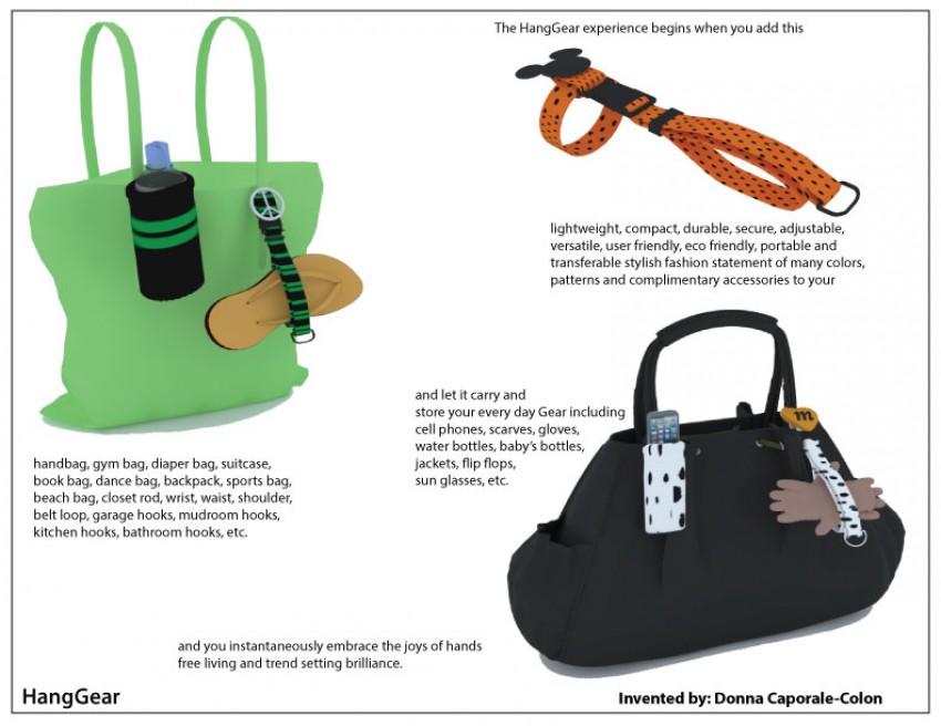 An innovative and considerably functional new fashion forward product designed to store, transport, and even package a variety of items, the Hangear, has been developed by Donna Caporale-Colon of New Haven, Connecticut. The invention’s unique design enables its users to add a trend-setting flare to the organization of footwear, cell phones, personal accessories and a variety of other items.